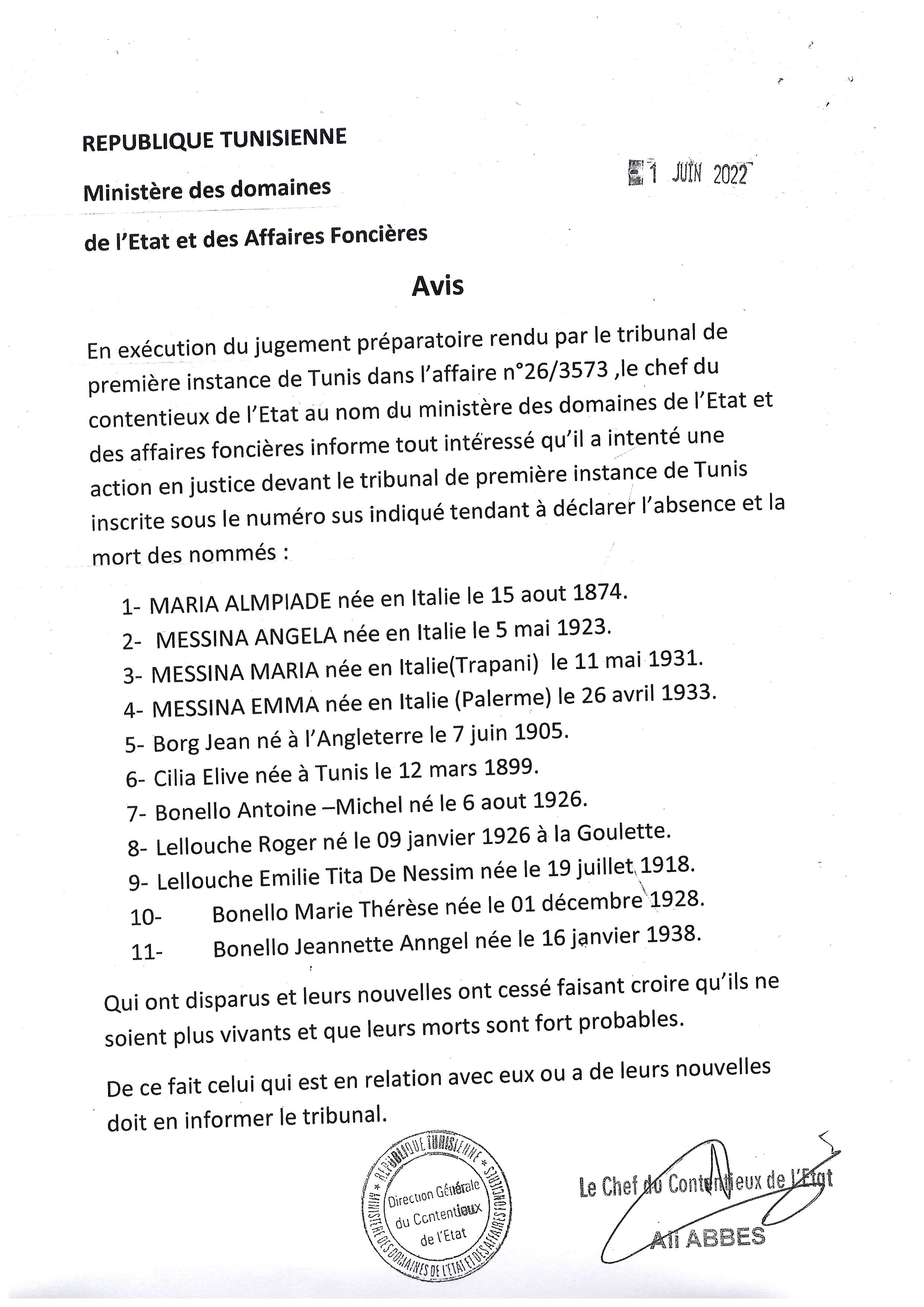 Avis Post published:9 ديسمبر 2022 Post category:الأخبار / الإعلانات Avis de jugement de disparition et de mort constatées judiciairement des nommés suivants: AVISTélécharger قد يعجبك ايضا تعلن وزارة أملاك الدولة والشؤون العقـارية البيع بالإشهار والمزاد العلني الإختياري لبيع كمية من حطب أشجار الزيتون تم قلعها وقصها متواجدة بالمكان 6 مايو 2024 كاتب الدّولة لأملاك الدّولة والشؤون العقارية يتفقد الإدارة العامة للتصرف والبيوعات ويشرف على موكب تنصيب المدير العام. 23 فبراير 2021 اعلان كراء عقار دولي فلاحي بولاية صفاقس للمرة الثانية 12 أبريل 2023