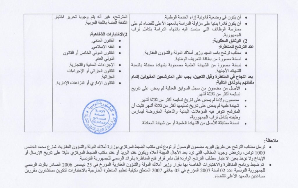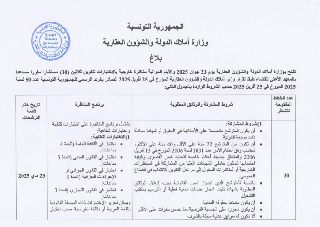 مناظرة خارجية بالاختبارات لتكوين مستشارين مقررين مساعدين بالمعهد الأعلى للقضاء بعنوان سنة 2025. Post published:2 مايو 2025 Post category:الأخبار / الإعلانات / مناظرات خارجية صدر يوم الجمعة 25 أفريل 2025 بالرائد الرسمي قرار يتعلق بفتح مناظرة خارجية بالاختبارات لتكوين مستشارين مقررين مساعدين بالمعهد الأعلى للقضاء بعنوان سنة 2025 قد يعجبك ايضا اعلان عن بتة لبيع أشجار صنوبر حلبي و كالتوس معدة لتقليع بضيعة عين الحمام معتمدية تبرسق 13 مايو 2025 في صفاقس وجندوبة : استرجاع عقارين دوليين فلاحيين بمساحة 64 هك. 6 مارس 2024 بلاغ إعلامي لوزارة أملاك الدولة والشؤون العقارية 23 فبراير 2021