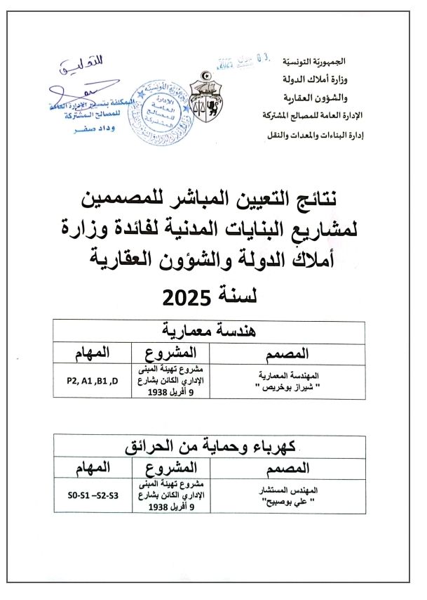 نتائج التعيين المباشر للمصممين لمشاريع البنايات المدنية لفائدة وزارة أملاك الدولة و الشؤون العقارية لسنة 2025 Post published:4 يونيو 2025 Post category:الأخبار / تكوين قد يعجبك ايضا سليانة : استرجاع عقار دولي فلاحي بمساحة 15 هك. 7 مارس 2024 جلسة عمل بين وزير أملاك الدولة والشؤون العقارية بالنيابة ونقابة مستشاري نزاعات الدّولة 30 مارس 2021 جندوبة: الدولة تسترجع حوالي 11 هك من أراضيها بشكل طوعي 23 فبراير 2021