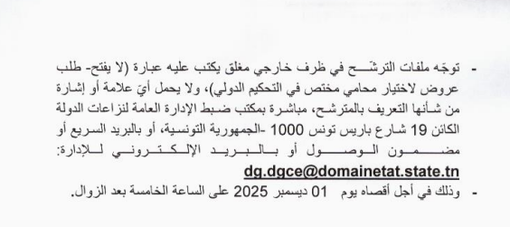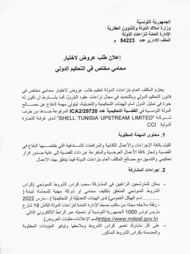 إعلان طلب عروض لاختيار محامي مختص في التحكيم الدولي Post published:20 نوفمبر 2025 Post category:الأخبار / الإعلانات / طلبات العروض قد يعجبك ايضا اعلان عن كراء بالمزاد العلني لمقطع حجارة كائن بجبل الفائض ولاية سيدي بوزيد 23 فبراير 2021 إعلان عن بتة لكراء عقار دولي فلاحي كائن بمعتمدية مرناق من ولاية بن عروس 23 فبراير 2021 إعلان كراء بالإشهار و المزاد العلني للعقار الدولي الفلاحي الكائن بمنطقة حريش معتمدية تبرسق 23 فبراير 2021
