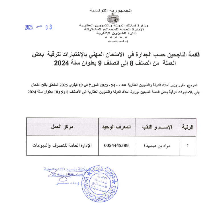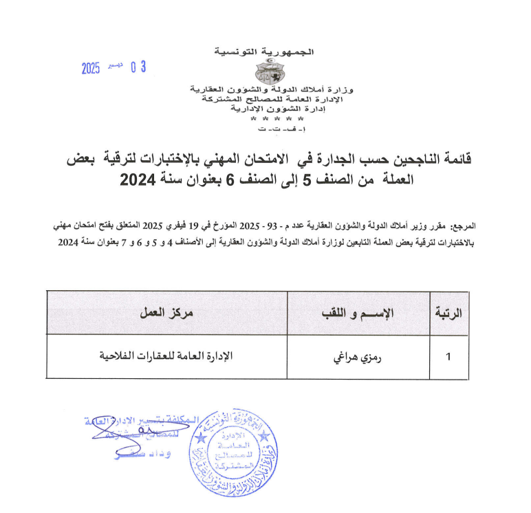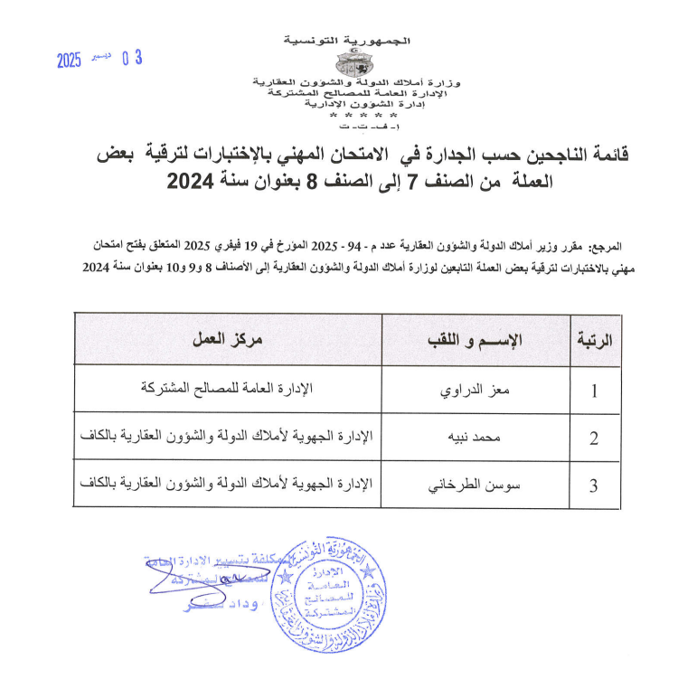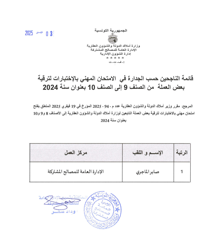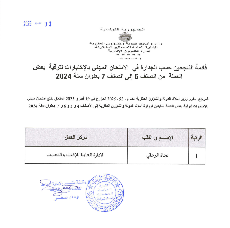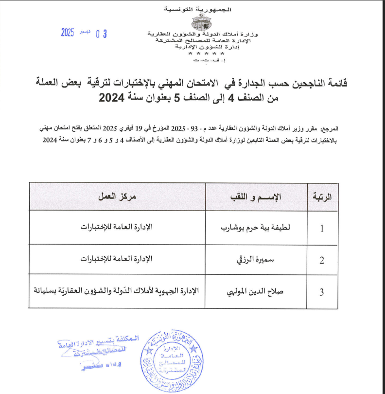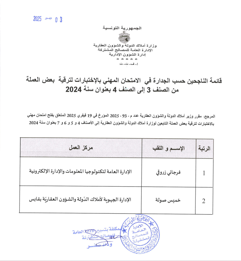 قائمات الناجحين حسب الجدارة في الإمتحان المهني بالإختبارات بعنوان سنة 2024. Post published:3 ديسمبر 2025 Post category:الأخبار / مناظرات داخلية قد يعجبك ايضا 17 فبراير 2026 تعيينات 23 فبراير 2021 توضيح الى الراي العام 23 فبراير 2021