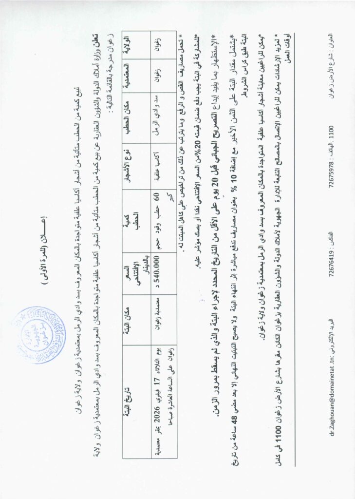 إعـــــــلان (للمرة الأولى) لبيع كمية من الحطب متأتية من أكاسيا بمعتمدية زغوان ولاية زغوان Post published:30 يناير 2026 Post category:الإعلانات / بتات وكراءات تحميل قد يعجبك ايضا تعلن وزارة أملاك الدولة والشؤون العقـارية البيع بالإشهار والمزاد العلني الإختياري لبيع صابة زيتون على رؤوس أشجارها متواجدة بمستشفى الأمراض النفسية بالقيروان حسب الجدول التالي : 20 يناير 2025 إعلان بتة عمومية بالإشهار والمزاد العلني الاختياري لبيع أشجار غابية معدة للقطع بمعتمدية سليانة الجنوبية ولاية سليانة 27 مارس 2025 إعلان إشهار تحديد لجنة تونس 23 فبراير 2021