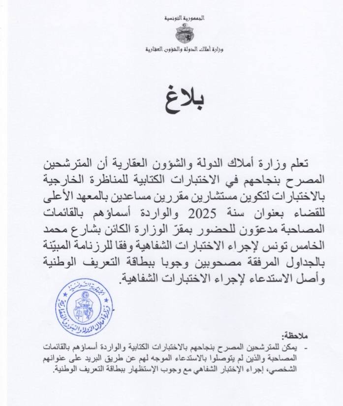 بلاغ Post published:11 فبراير 2026 Post category:الأخبار / مناظرات خارجية قد يعجبك ايضا وزير أملاك الدّولة والشؤون العقارية في مجلس نواب الشعب. 3 يوليو 2024 وزير أملاك الدّولة يلتقي رئيس الهيئة العليا المستقلة للانتخابات. 6 مارس 2023 الدولة تسترجع عقاراتها بجندوبة 23 فبراير 2021